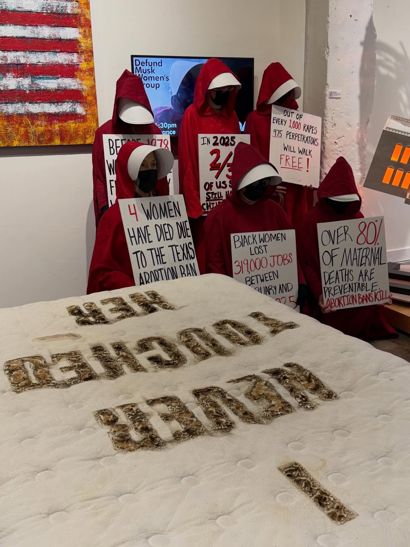 View fullsize Great turnout tonight! Performance by @defundmusk Women’s Group, perfect backdrop to my “denial” piece, if I do say so myself ;) More cool art and dinner with bestie 👯‍♀️